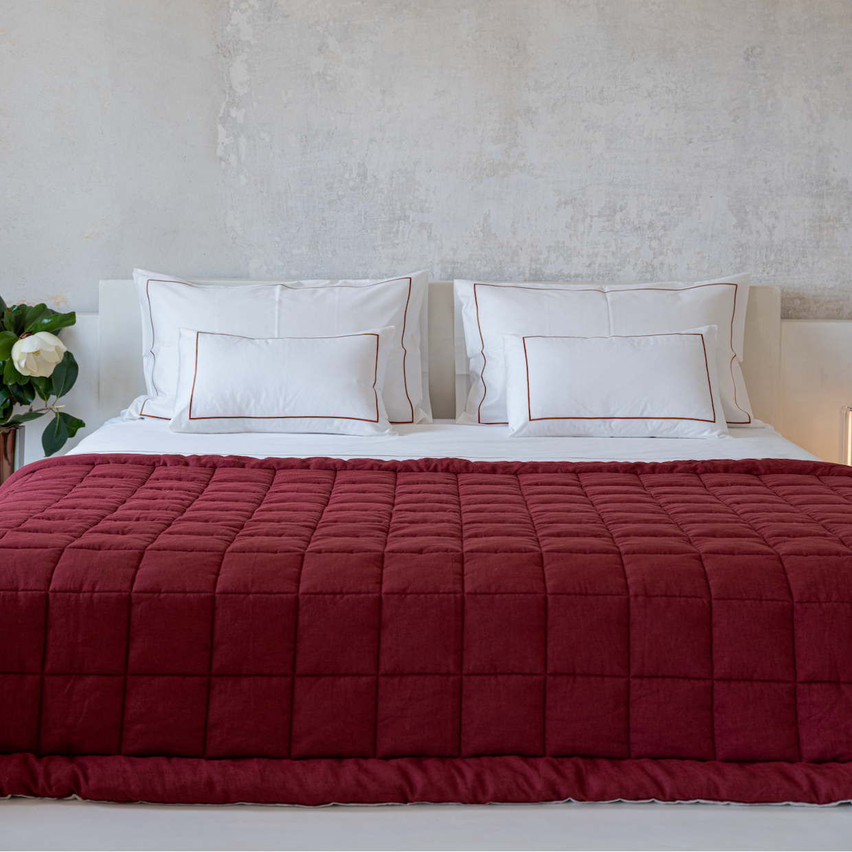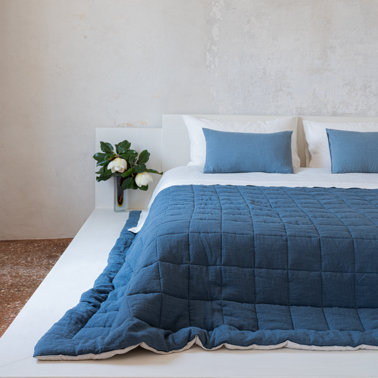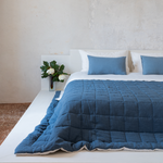 The quilt with box stitch is available in a select colour palette: super king size in stone blue and sage and single size in bordeaux or brown. All quilts have a natural linen reverse side.