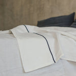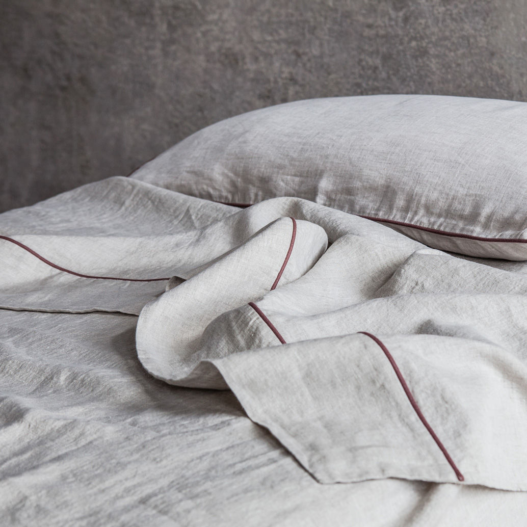 Slide under crushed linen top sheets enhanced with piping trims in colour combinations of your choice. Little else compares to linen bed linen which is warm and luxuriously cocooning during the cold winter months and yet is cool and light when the weather turns warmer. Contrasting colours in piping is a subtle way to add a mix of colours to your bedscape. Team with pillowcases with signature piping trims and fitted sheets in an extensive palette of tonal neutrals or punchy bolder shades.