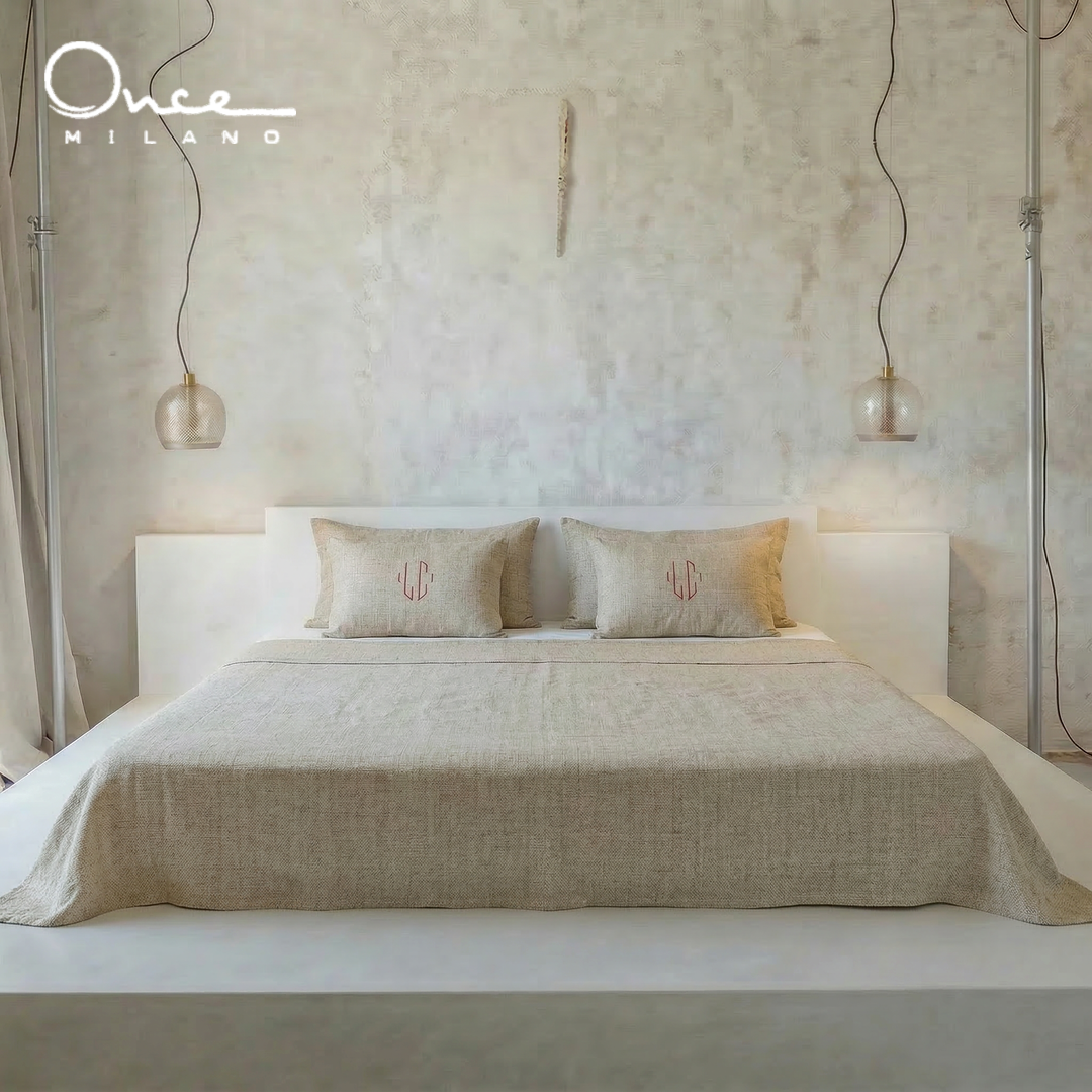 bed cover with sewing in contrasting colours in heavy linen ARCHIVE