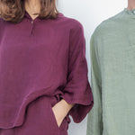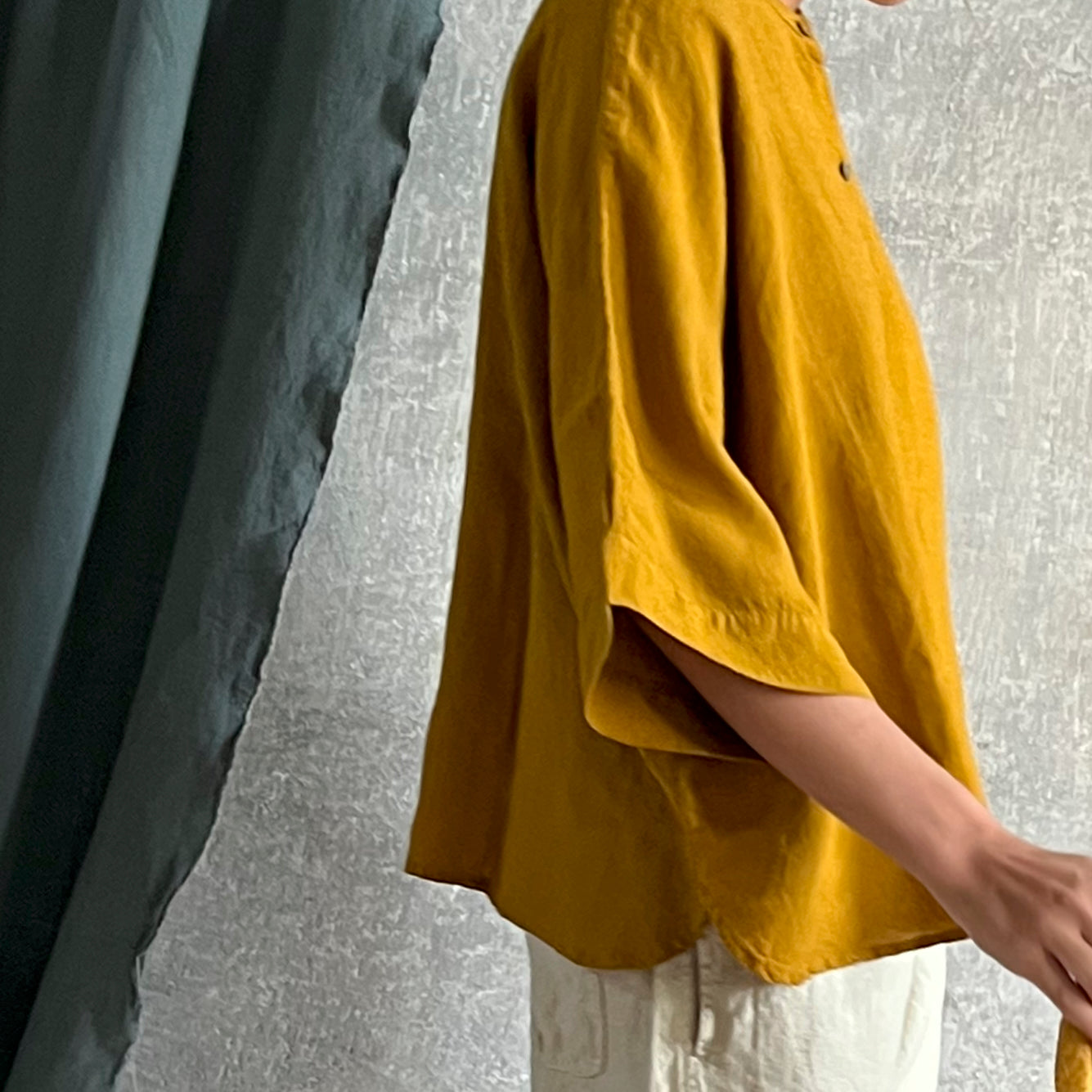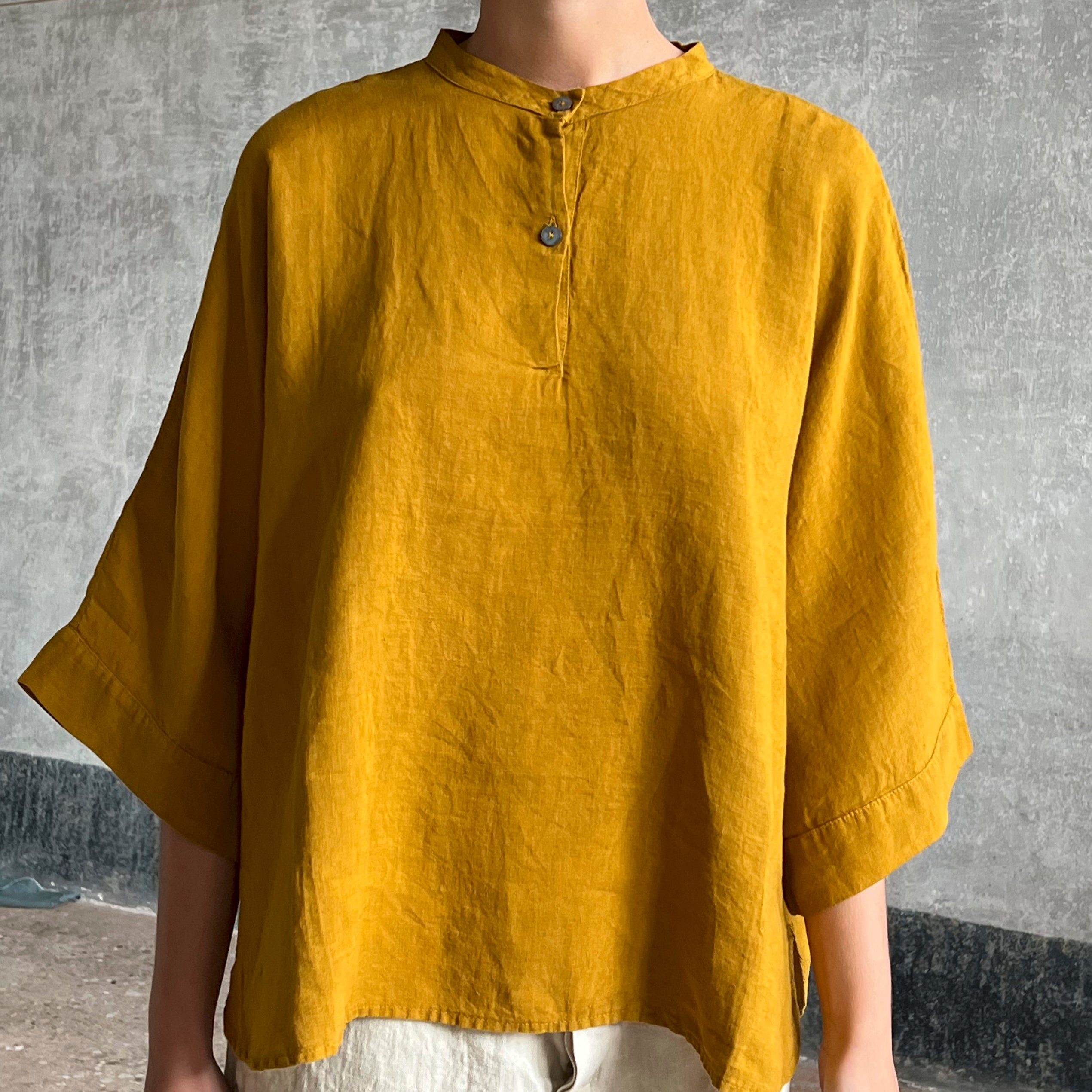 Finished with a mandarin collar and two buttons.