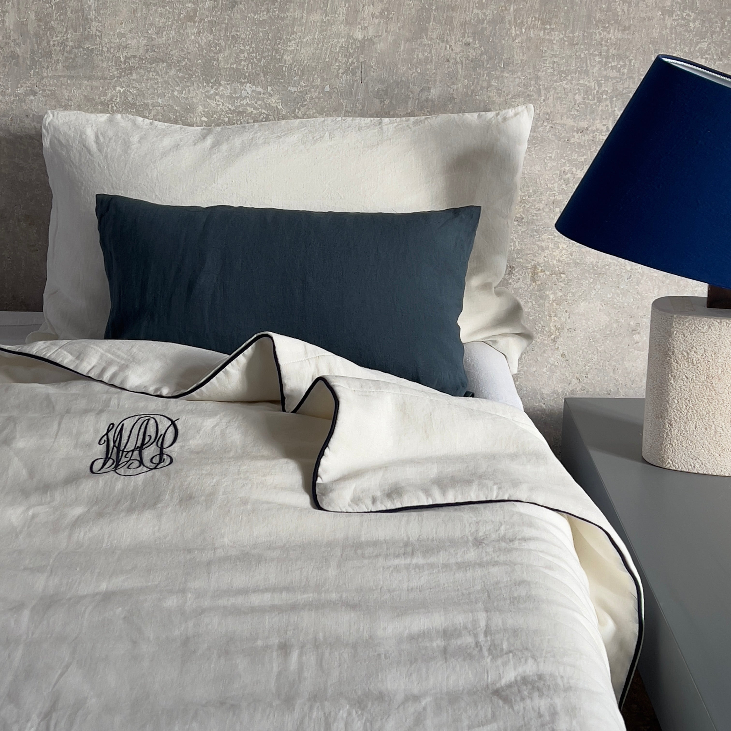 The bottom is made in natural or white linen paired with a top colour of your choice and edged in a piping colour of your choice.