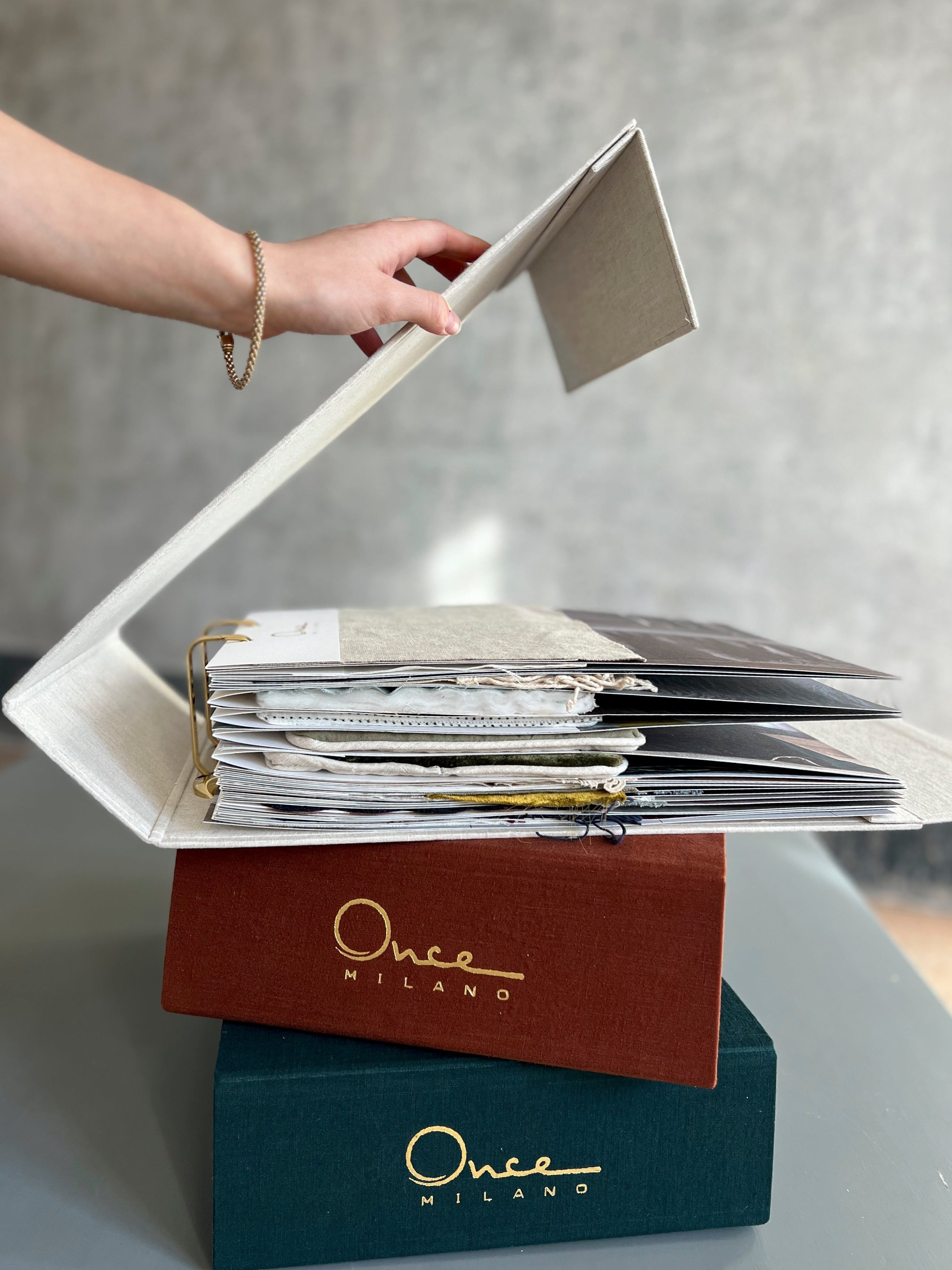 We are happy to now share the opportunity for our partners to purchase our sample book. This beautifully presented binder presents samples of all our detailed finishes and fabrics. It is a practical and elegant resource that can be shown to clients or used in the office.